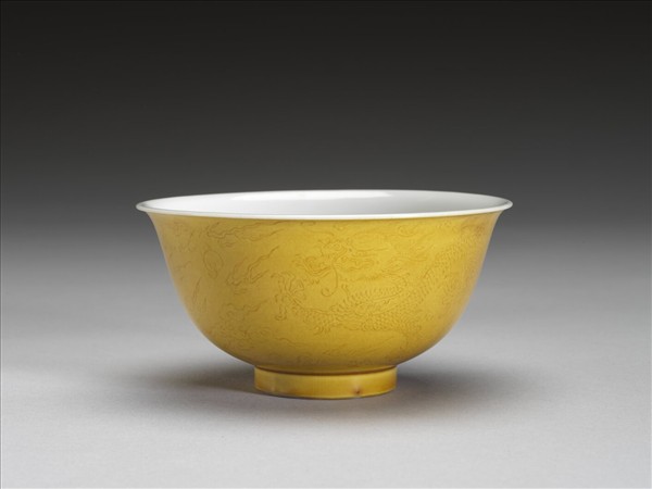 黃釉白裡劃花龍紋碗
