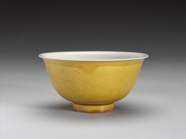 黃釉白裡劃花龍紋碗