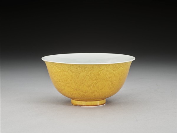 黃釉白裡劃花龍紋碗