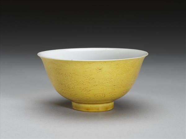 黃釉白裡劃花龍紋碗