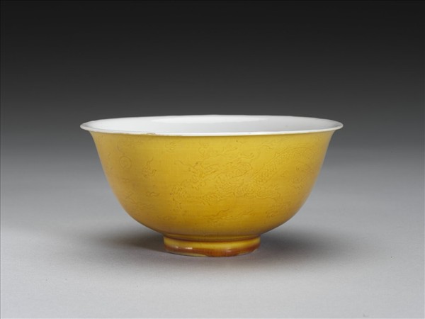 黃釉白裡劃花龍紋碗