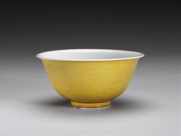 黃釉白裡劃花龍紋碗