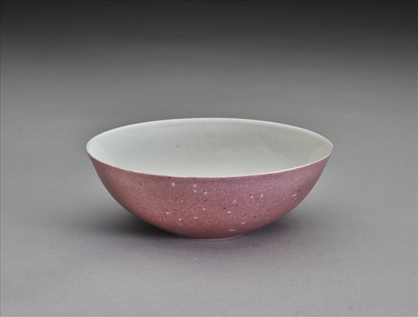 敞口,淺弧壁,矮圈足。器內施白釉,釉面冰裂,並飾有暗花八寶紋,外壁施胭脂紅彩。足底白釉處有「成化年製」二行四字青花楷書款,外加方框。