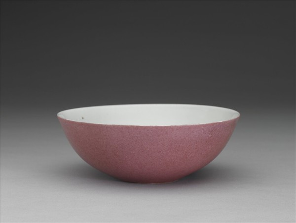 敞口,淺弧壁,矮圈足。器內施白釉,並飾有暗花八寶紋,外壁施胭脂紅彩。足底白釉處有「成化年製」二行四字青花楷書款,外加方框。