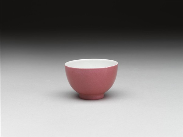 敞口,弧壁,矮圈足。器內施白釉,外壁施胭脂紅彩,足底露出白釉。