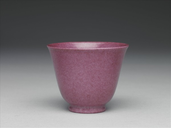 撇口,深腹,矮圈足。通體施罩胭脂紅彩,圈足底及底外露出白釉,底有「大明成化年製」二行六字青花楷書款,外加雙方框。