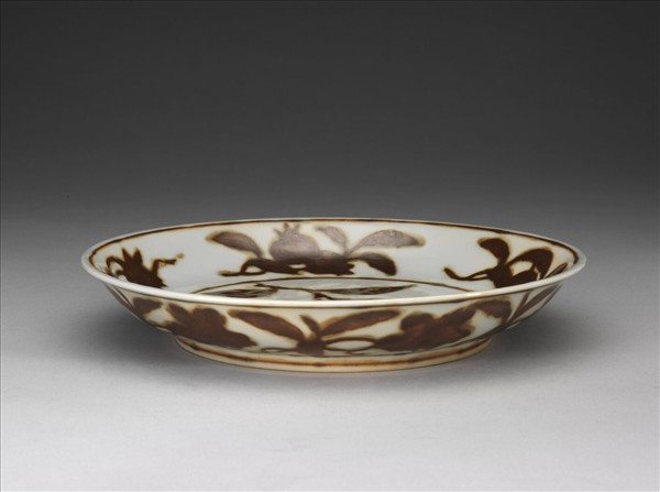 侈口窄唇,淺壁弧形,矮圈足。內壁刻畫石榴、葡萄等四折枝,盤心刻玉蘭花一枝。外壁雕轉枝牡丹花。厚胎白釉,花紋加填紫金釉,內外分飾紫金線四道。底有青花書「大明正德年製」二行六字楷款,外加雙圈。
