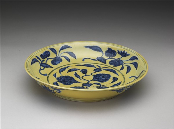 侈口窄唇,淺壁,矮圈足。內壁畫荔枝、枇杷等四種果實,盤心畫石榴花一枝,外壁畫番蓮花四朵。內外分畫青線十道。原為白地青花,加施黃釉一層。底有青花書「大明正德年製」二行六字楷款,外加雙圈。