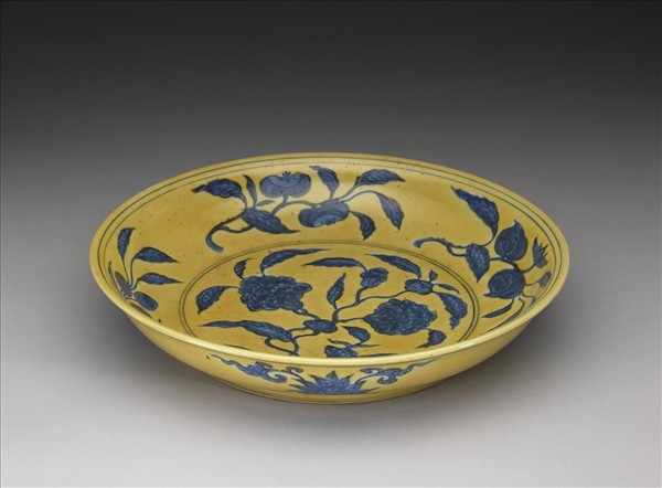 侈口窄唇,淺壁,矮圈足。內壁畫荔枝、枇杷等四種果實,盤心畫石榴花一枝,外壁畫番蓮花四朵。內外分畫青線十道。原為白地青花,加施黃釉一層。底有青花書「大明正德年製」二行六字楷款,外加雙圈。