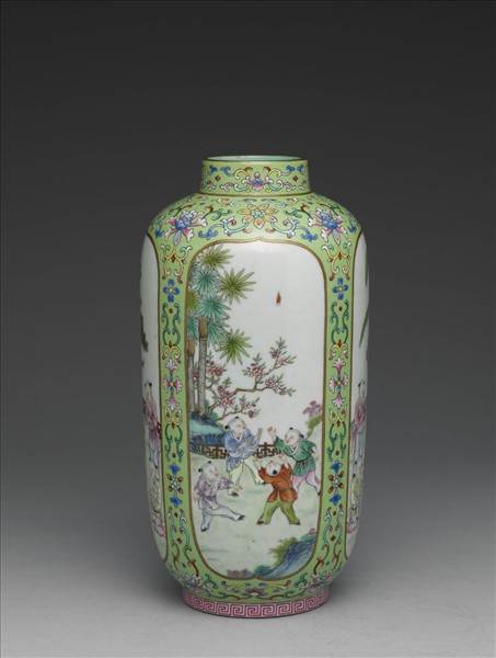 斂口,短頸,長腹,矮圈足。胎質較厚,器面淺綠錦花地,彩畫纏枝番蓮花,腹部四開光,分畫十六嬰兒嬉戲圖。足圈粉紅地,畫紅回紋一周。器內及底均施淺綠色釉。底有硃紅書「大清乾隆年製」六篆字款。