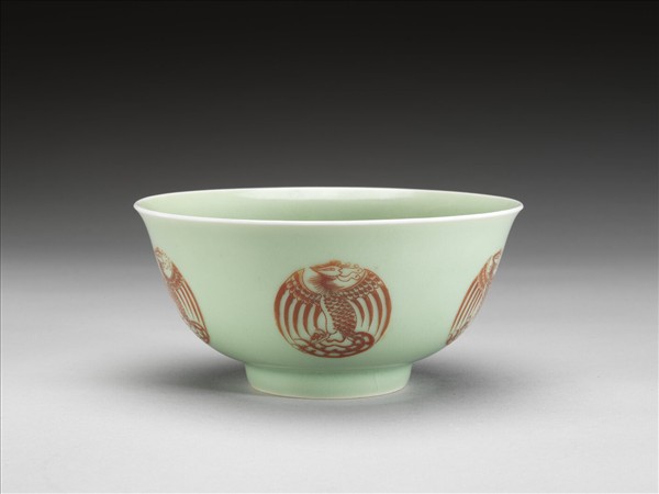 冬青釉描紅團鳳紋碗
