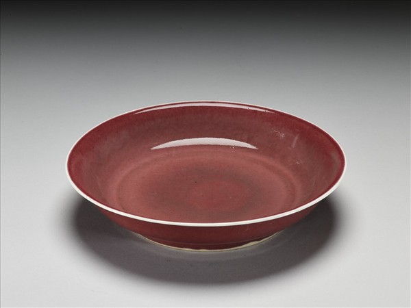 侈口窄唇,淺弧形壁,矮圈足。全器施霽紅釉,施釉至足邊,口沿與足邊各留一道白邊,足緣無釉露白胎。足內壁及底施白釉,底有青花書「大明宣德年製」六字二行楷款,外加雙圈。