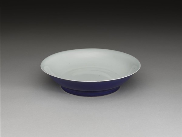 侈口,淺壁弧形,矮圈足。胎質稍厚,外壁施霽青釉,內壁、盤心及底純白,樸素無紋飾。底有「大明宣德年製」六字二行楷體暗款,外加雙圈。
