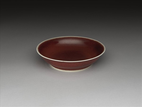 侈口窄唇,淺弧形壁,矮圈足。全器施霽紅釉,施釉至足邊,口沿與足邊各留一道白邊,足緣無釉露白胎。足內壁及底施白釉,底有「大明宣德年製」六字二行楷體暗款,外加雙圈。