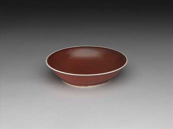 侈口窄唇,淺弧形壁,矮圈足。全器施霽紅釉,施釉至足邊,口沿與足邊各留一道白邊,足緣無釉露白胎。足內壁及底施白釉,底有「大明宣德年製」六字二行楷體暗款,外加雙圈。