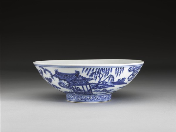 侈口,弧壁,矮圈足,底微凸。外壁繪山水樓閣、雲、石、花、木,樓閣內一仕女吹簫,迎面一仙女乘鳳駕雲而至,此題材又稱「吹簫引鳳圖」,足圈上畫卷草紋一周,口、足各加飾青線六道。器內無紋,白釉微泛青,青花勻濃,胎骨較厚,圈足露胎,質堅細潔,胎釉一線呈淺橙色。底足雙圈內書「大明宣德年製」二行六字楷款。