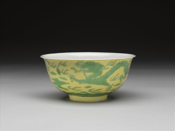 黃地綠彩白裡雙龍戲珠紋碗