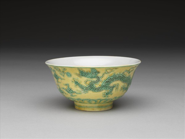 黃地綠彩白裡雙龍戲珠紋碗