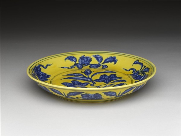 侈口窄唇,淺壁,矮圈足。內壁畫青花石榴、葡萄等四種果實,盤心畫玉蘭一枝。外壁畫轉枝牡丹花七朵。內外分畫青線十道。原為白地青花,加施黃釉一層。底有青花書「大明弘治年製」二行六字楷款,外加雙圈。