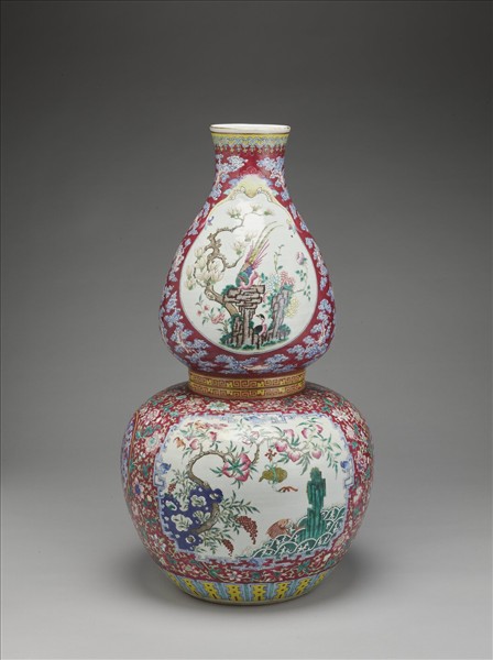 粉彩紅地花鳥福壽紋葫蘆瓶