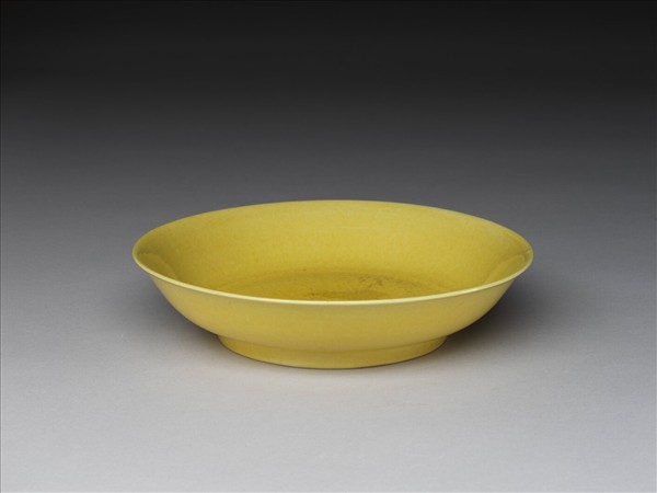 侈口,淺壁弧形,矮圈足。胎質較薄,器內外壁滿施嬌黃釉,盤底純白,樸素無紋飾。底有青花書「大明弘治年製」二行六字楷款,外加雙圈。