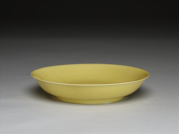 侈口,淺壁弧形,矮圈足。胎質較薄,器內外壁滿施嬌黃釉,盤底純白,樸素無紋飾。底有青花書「大明弘治年製」二行六字楷款,外加雙圈。