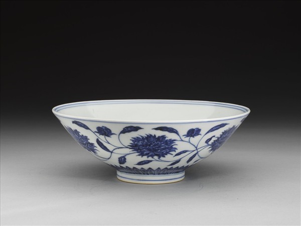 侈口,淺壁,矮圈足。外壁畫纏枝番蓮花六朵,底邊畫蓮瓣紋一週,口足間加飾青線六道。碗內底心畫葵花一朵,邊加雙線,週壁純白無紋飾。底有青花書「大明宣德年製」二行六字楷款,外加雙圈。