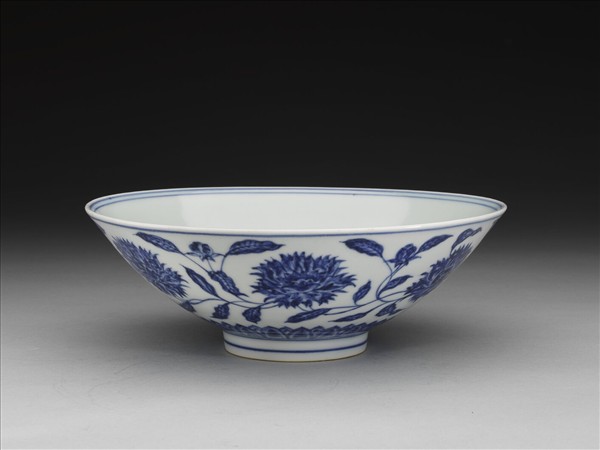 侈口,淺壁,矮圈足。外壁畫纏枝番蓮花六朵,底邊畫蓮瓣紋一週,口足間加飾青線六道。碗內底心畫葵花一朵,邊加雙線,週壁純白無紋飾。底有青花書「大明宣德年製」二行六字楷款,外加雙圈。