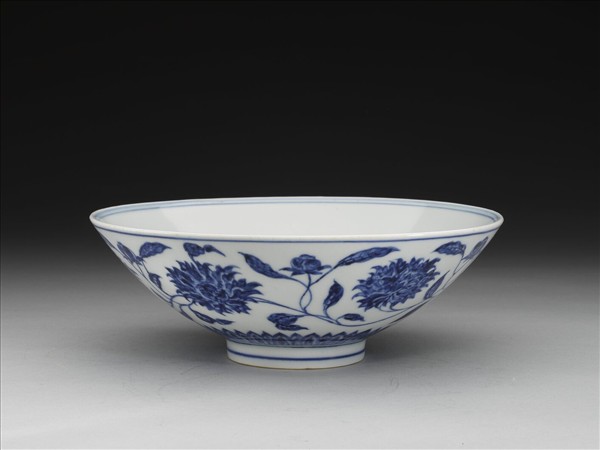 侈口,淺壁,矮圈足。外壁畫纏枝番蓮花六朵,底邊畫蓮瓣紋一週,口足間加飾青線六道。碗內底心畫葵花一朵,邊加雙線,週壁純白無紋飾。底有青花書「大明宣德年製」二行六字楷款,外加雙圈。
