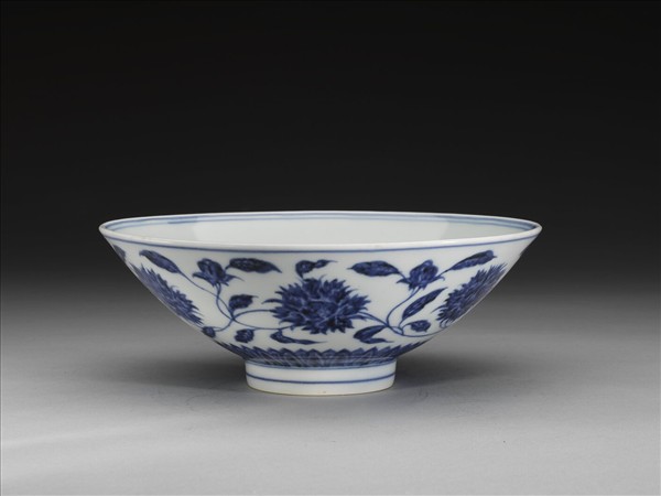 侈口,淺壁,矮圈足。外壁畫纏枝番蓮花六朵,底邊畫蓮瓣紋一週,口足間加飾青線六道。碗內底心畫葵花一朵,邊加雙線,週壁純白無紋飾。底有青花書「大明宣德年製」二行六字楷款,外加雙圈。
