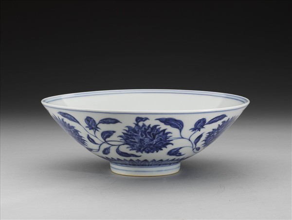 侈口,淺壁,矮圈足。外壁畫纏枝番蓮花六朵,底邊畫蓮瓣紋一週,口足間加飾青線六道。碗內底心畫葵花一朵,邊加雙線,週壁純白無紋飾。底有青花書「大明宣德年製」二行六字楷款,外加雙圈。