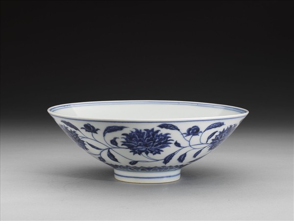 侈口,淺壁,矮圈足。外壁畫纏枝番蓮花六朵,底邊畫蓮瓣紋一週,口足間加飾青線六道。碗內底心畫葵花一朵,邊加雙線,週壁純白無紋飾。底有青花書「大明宣德年製」二行六字楷款,外加雙圈。