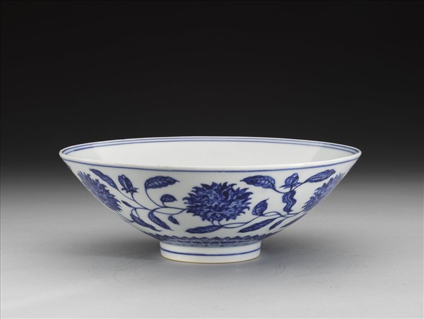 侈口,淺壁,矮圈足。外壁畫纏枝番蓮花六朵,底邊畫蓮瓣紋一週,口足間加飾青線六道。碗內底心畫葵花一朵,邊加雙線,週壁純白無紋飾。底有青花書「大明宣德年製」二行六字楷款,外加雙圈。