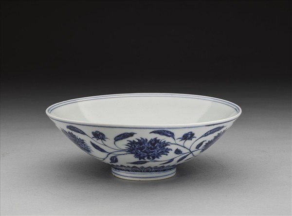 侈口,淺壁,矮圈足。外壁畫纏枝番蓮花六朵,底邊畫蓮瓣紋一週,口足間加飾青線六道。碗內底心畫葵花一朵,邊加雙線,週壁純白無紋飾。底有青花書「大明宣德年製」二行六字楷款,外加雙圈。