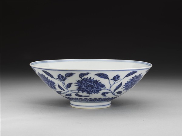 侈口,淺壁,矮圈足。外壁畫纏枝番蓮花六朵,底邊畫蓮瓣紋一週,口足間加飾青線六道。碗內底心畫葵花一朵,邊加雙線,週壁純白無紋飾。底有青花書「大明宣德年製」二行六字楷款,外加雙圈。