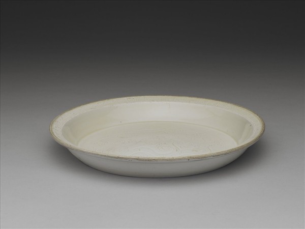 盤,侈口出唇,淺壁,平底凹足。口唇上劃回紋一周,底心劃雲龍紋,邊劃淺線一道。整器施牙白釉,釉色勻潤,口沿露胎。底刻有「壽成殿」三字。