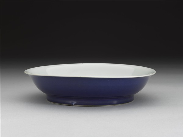侈口,淺壁弧形,矮圈足。胎質稍厚,外壁施霽青釉,內壁、盤心及底純白,樸素無紋飾。底有青花書「大明宣德年製」六字二行楷款,外加雙圈。