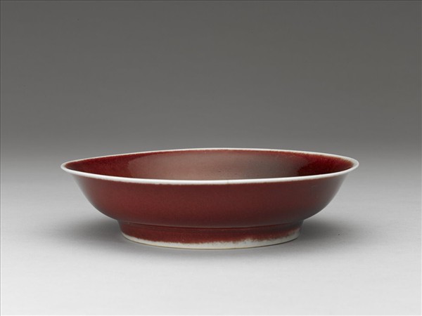 侈口窄唇,淺弧形壁,矮圈足。全器施霽紅釉,施釉至足邊,口沿與足邊各留一道白邊,足緣無釉露白胎。足內壁及底施白釉,底有青花書「大明宣德年製」六字二行楷款,外加雙圈。