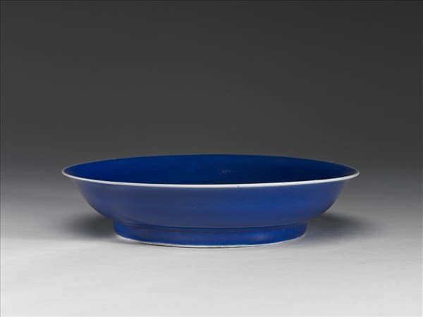 侈口窄唇,淺弧形壁,矮圈足。內壁淺劃雙龍紋,糢糊不清。全器施霽青釉,施釉至足邊,口沿與足邊各留一道白邊,足緣無釉露白胎。足內壁及底施白釉,底有「大明宣德年製」六字二行楷體暗款,外加雙圈。