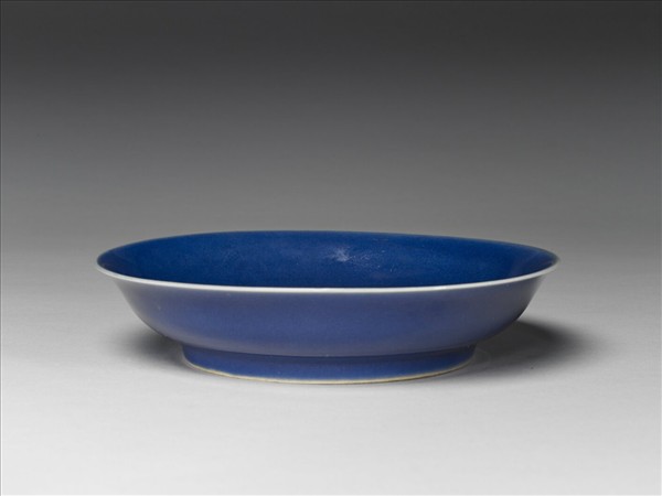 侈口窄唇,淺弧形壁,矮圈足。內壁淺劃雙龍紋,糢糊不清。全器施霽青釉,施釉至足邊,口沿與足邊各留一道白邊,足緣無釉露白胎。足內壁及底施白釉,底有「大明宣德年製」六字二行楷體暗款,外加雙圈。