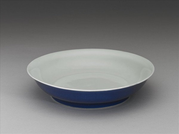 侈口,淺壁弧形,矮圈足。胎質稍厚,外壁施霽青釉,內壁錐拱雙龍紋,糢糊不清。盤心及底純白,樸素無紋飾。底有「大明宣德年製」六字二行楷體暗款,外加雙圈。