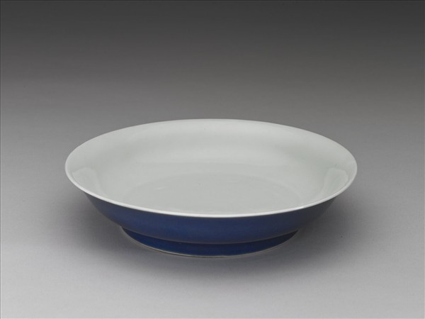 侈口,淺壁弧形,矮圈足。胎質稍厚,外壁施霽青釉,內壁錐拱雙龍紋,糢糊不清。盤心及底純白,樸素無紋飾。底有「大明宣德年製」六字二行楷體暗款,外加雙圈。