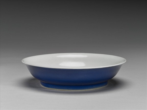 侈口,淺壁弧形,矮圈足。胎質稍厚,外壁施霽青釉,內壁錐拱雙龍紋,糢糊不清。盤心及底純白,樸素無紋飾。底有「大明宣德年製」六字二行楷體暗款,外加雙圈。