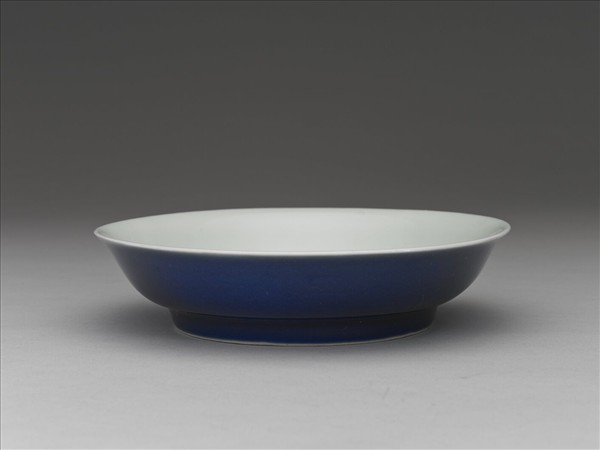 侈口,淺壁弧形,矮圈足。胎質稍厚,外壁施霽青釉,內壁錐拱雙龍紋,糢糊不清。盤心及底純白,樸素無紋飾。底有「大明宣德年製」六字二行楷體暗款,外加雙圈。