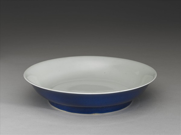 侈口,淺壁弧形,矮圈足。胎質稍厚,外壁施霽青釉,內壁錐拱雙龍紋,糢糊不清。盤心及底純白,樸素無紋飾。底有「大明宣德年製」六字二行楷體暗款,外加雙圈。
