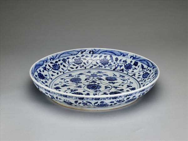 侈口,淺壁,矮圈足。厚胎白釉。器內口沿下畫波濤紋,器外口沿下畫轉枝靈芝。內外壁均畫纏枝牡丹、菊花等四季花卉。盤心畫纏枝蓮花。內外花紋間加飾青線九道。器底全部露白胎。