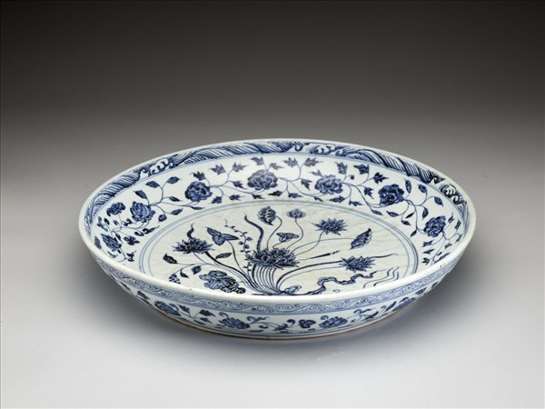 侈口,淺壁,矮圈足。內壁畫菊、蓮、梔子、石榴、芍藥、芙蓉、茶花等十三朵,外壁則有類似花卉十四朵,盤心主紋把蓮一束。內壁口沿下飾波濤紋一周,上下青線六道。外壁口沿下畫卷草一周,底邊回紋,紋飾間加飾青線。