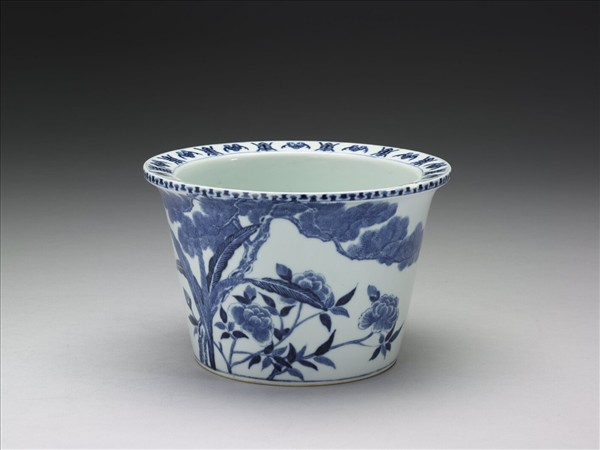 花盆折沿,深腹下斂,平底,淺圈足。口沿描繪蝙蝠、銅錢及壽字紋,器腹以青花寫實松枝、芭蕉及芍藥。足底露白胎,底青花書「體和殿製」篆款。器底兩圓形滲水孔,後填泥防堵,應是改製作為種植喜水性,類似石菖蒲、水仙、養苔石或作為假花盆景等器皿之用。就紋飾來觀察,松枝、芭蕉寓意長青不老,芍藥向有富貴之意,蝙蝠與銅錢有「福在眼前」的諧音意,整體紋飾充滿吉祥的意涵。「體和殿製」款的瓷器,常以「福」、「壽」等字為紋飾,除直接表達瓷器是為慶祝慈禧五十大壽而訂製,也顯示瓷器獨特的設計理念。帶有祥意紋飾的花器,常種植有吉祥意的植栽。例如清末宮廷畫家沈全畫〈桂花〉(故畫02892)及張愷的〈盆桂〉(故畫02904),青花花盆裝飾「福祿壽喜」及團「壽」字樣。盆內老枝丹「桂」與「貴」諧音,整盆花充滿祈願語意。