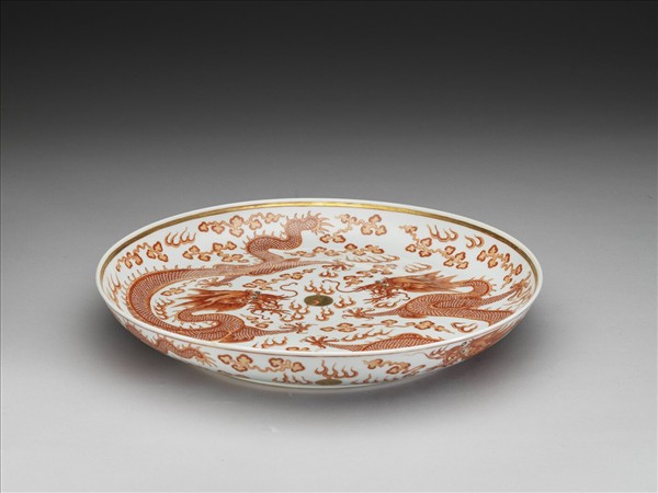 描紅雙龍戲珠紋盤
