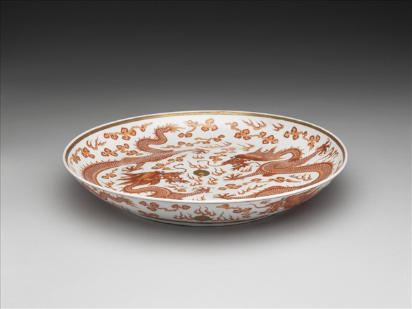 描紅雙龍戲珠紋盤